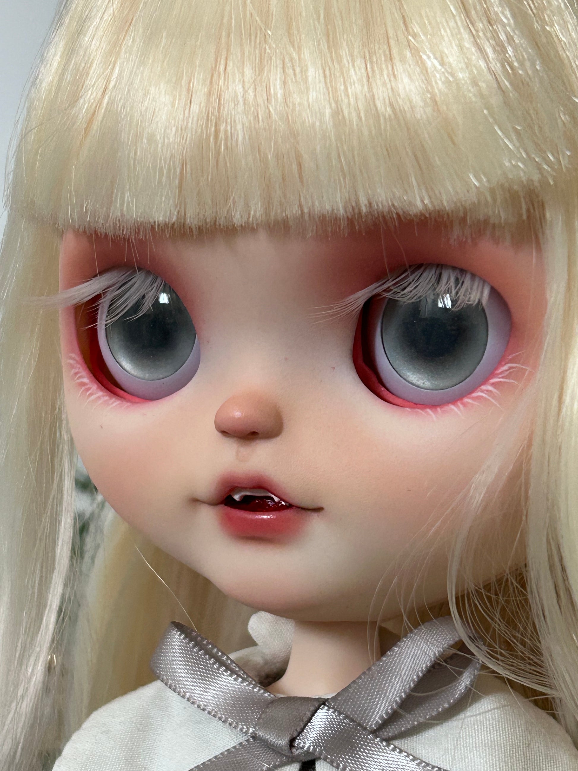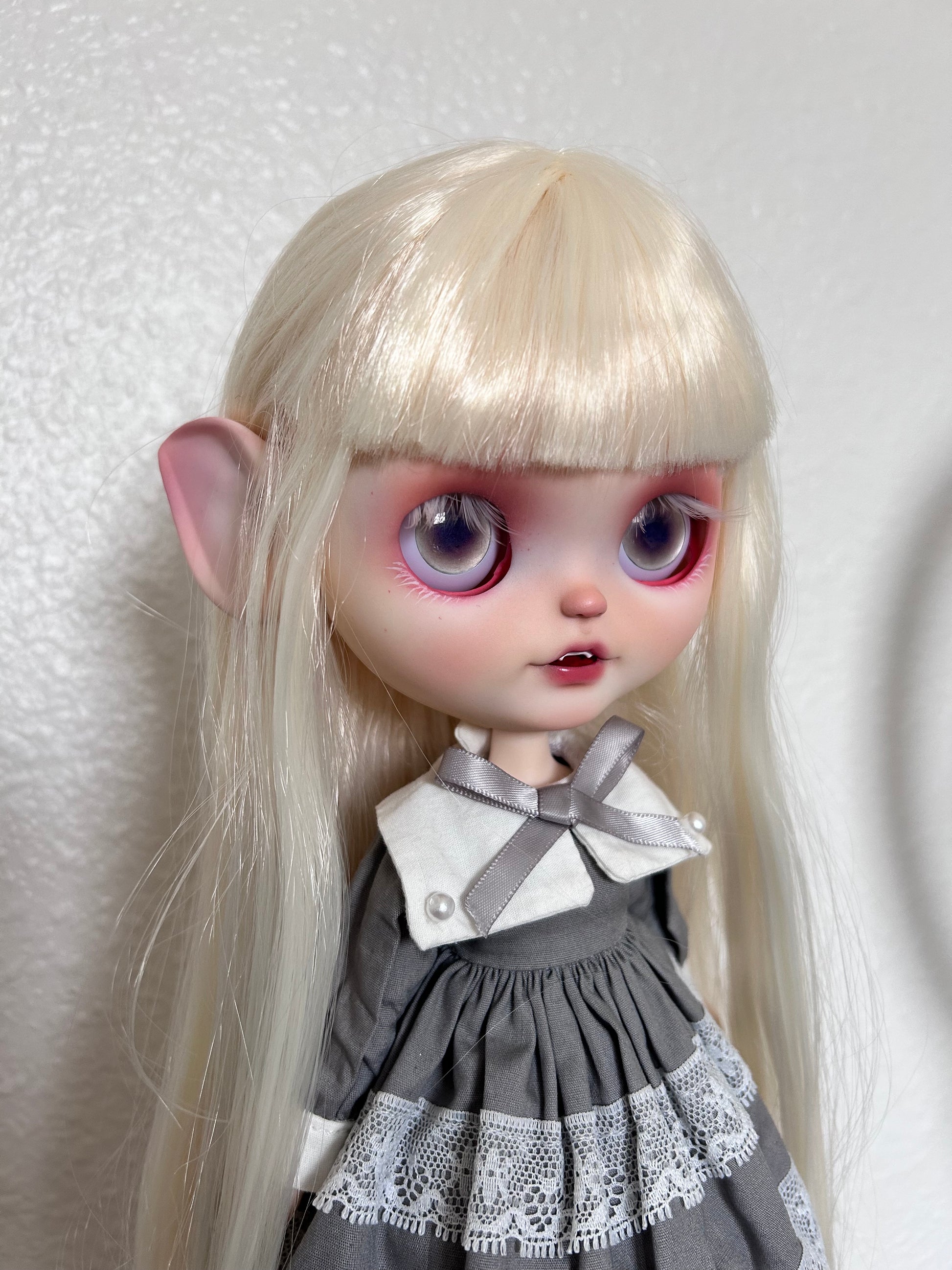 She is customized from a TBL/fake Blythe, with an open-mouth faceplate. She originally had a Doll Home articulated body, but has been switched onto the standard fake Azone body. Please keep in mind that due to the inside structure of the face plate used, her neck can be a bit wobbly when her head is tilted down. Though it’s only visible when the light reflects off her face at a specific angle, she has a tiny speck from sealant near her upper lip (seen in photo #5). Please carefully look through all the photos before buying.